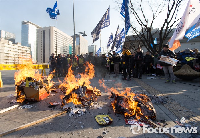 (서울=포커스뉴스) 27일 오후 서울 종로구 세종로 소공원에서 열린 '민주노총 총파업 수도권대회'에 참가한 민주노총 조합원들이 정부의 노동법 개정 중단을 촉구하는 퍼포먼스를 펼치고 있다.