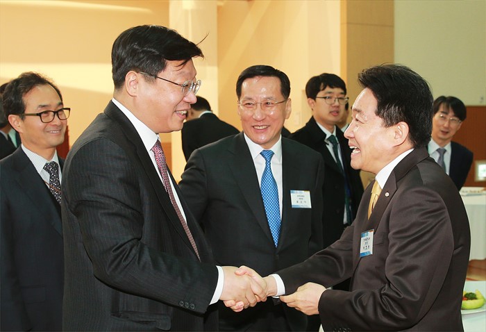 (세종=포커스뉴스) 주형환 산업통상자원부 장관이 27일 오전 세종시 정부세종청사 산업부 다목적홀에서 열린 '2016 산업통상자원부 유관기관 신년인사회'에 참석해 기관장들과 악수를 나누고 있다. <사진제공=산업통상자원부>