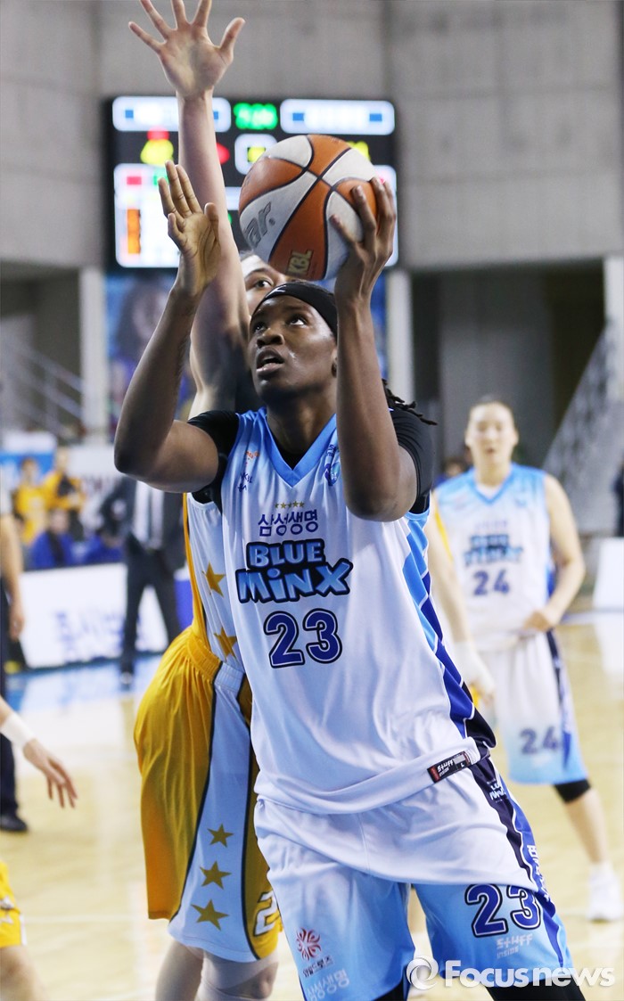 (용인=포커스뉴스) 27일 용인실내체육관에서 열린 2015-2016 여자프로농구 삼성생명-KB스타즈 경기에서 삼성생명 해리스가 KB스타즈 햄비를 제치고 슈팅을 시도하고 있다.