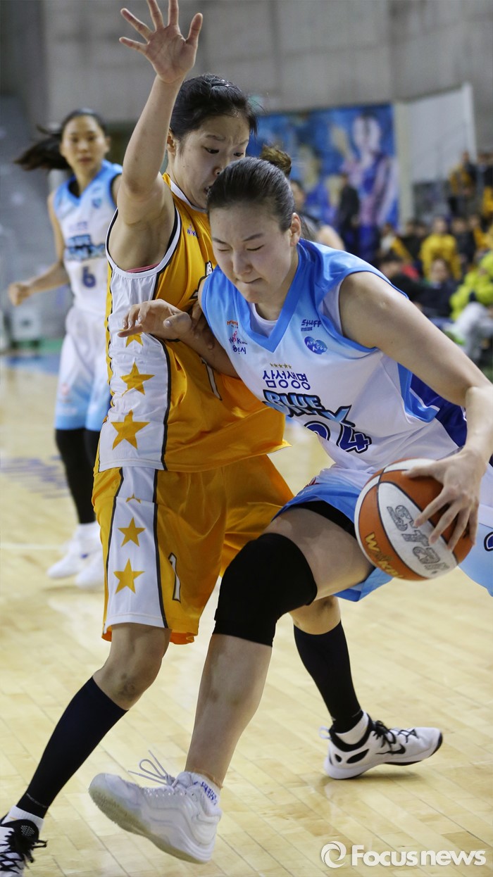 (용인=포커스뉴스) 27일 용인실내체육관에서 열린 2015-2016 여자프로농구 삼성생명-KB스타즈 경기에서 삼성생명 배혜윤의 돌파를 KB스타즈 홍아란이 저지하고 있다.