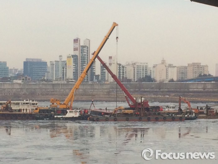 유람선 침몰의 정확한 원인은 인양한 이후에 조사될 것으로 보인다.28일 오전 11시쯤 서울 광진구 영동대교 남단 부근 한강에서 침몰한 유람선 '코코몽호'를 인양하기 위해 크레인 등 장비가 설치돼 있다. 2016.01.28 박요돈기자 smarf0417@focus.co.kr