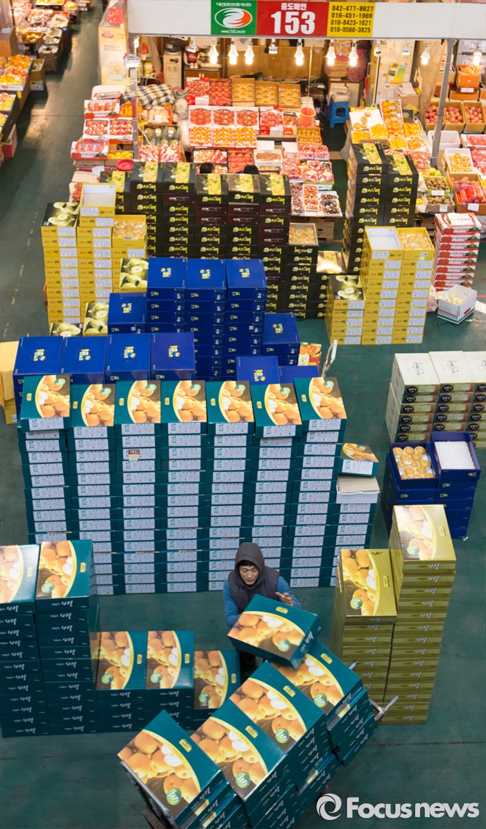 (대전=포커스뉴스) 설 멸정을 앞두고 28일 오전 대전 유성구 농수산물도매시장에서 상인들이 대목준비에 바쁘게 움직이고 있다.