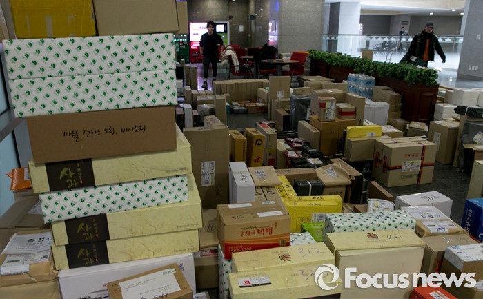 (서울=포커스뉴스) 설을 열흘여 앞둔 28일 오후 서울 여의도 국회 의원회관에 의실로 배달된 택배들이 쌓여 있다.
