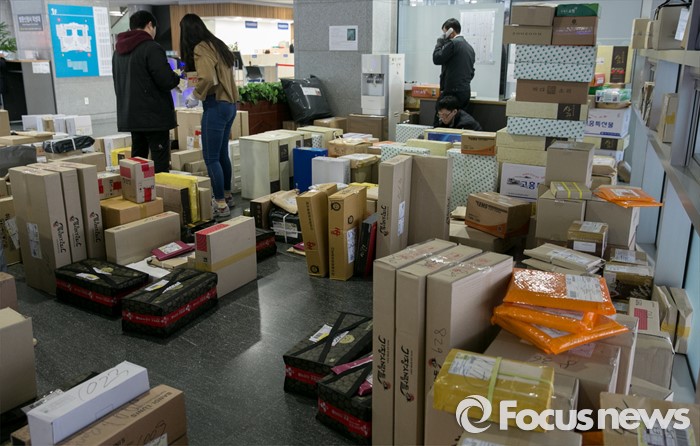 (서울=포커스뉴스) 설을 열흘여 앞둔 28일 오후 서울 여의도 국회 의원회관에 의실로 배달된 택배들이 쌓여 있다.