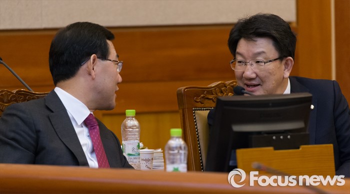(서울=포커스뉴스) 28일 오후 서울 종로구 헌법재판소 대심판정에서 새누리당 주호영(왼쪽부터), 권성동 의원이 국회 선진화법 권한쟁의 공개변론에 앞서 청구인석에 앉아 대화를 나누고 있다.