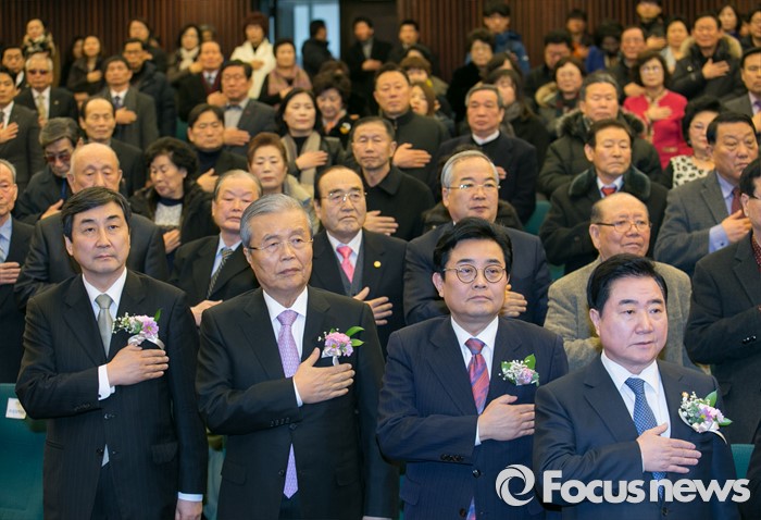 (서울=포커스뉴스) 28일 오후 서울 여의도 국회도서관에서 열린 더불어민주당 60년사 출판기념회에 참석한 이석현(앞줄 오른쪽부터) 국회 부의장, 전병헌 창당60주년 기념사업추진위원장, 김종인 비대위원장, 이종걸 원내대표 등 참석자들이 국기에 대한 경례를 하고 있다.