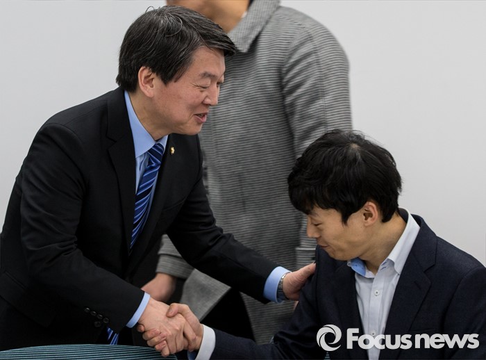 (서울=포커스뉴스) 28일 오후 서울 강남구 창업지원센터에서 열린 '국민의당-핀테크 기업인 간담회'에 참석한 안철수 인재영입위원장이 한 기업인과 악수 하고 있다.