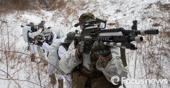 (평창=포커스뉴스) 28일 강원도 평창군 황병산 해병대 산악 종합훈련장에서 열린 '한·미 해병대 연합 동계 설한지 훈련'에 해병대 수색대대와 미 해병대 3사단 수색중대 장병들이 참가하고 있다.