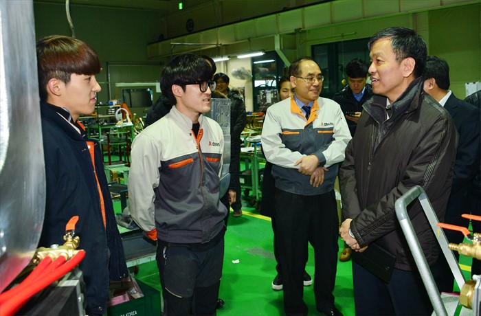 (화성=포커스뉴스) 최상목 기획재정부 차관이 28일 경기 화성시 소재 한국오바라(주)를 현장 방문해 기업 현장을 시찰하며 청년근로자들과 대화를 하고 있다. <사진제공=기획재정부>
