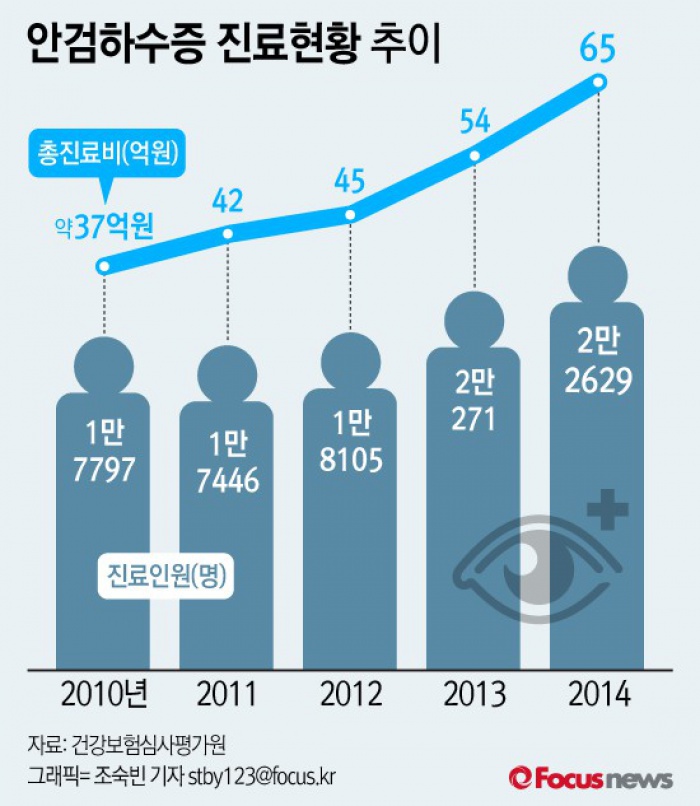 (서울=포커스뉴스) 28일 건강보험심사평가원(원장 손명세)이 ‘안검하수'에 대해 최근 5년간(2010~2014년) 심사결정자료(건강보험 및 의료급여)를 분석한 결과에 따르면, 2014년 기준 진료인원은 약 2만 2629명으로 2010년 대비 27.3% 증가했다.
