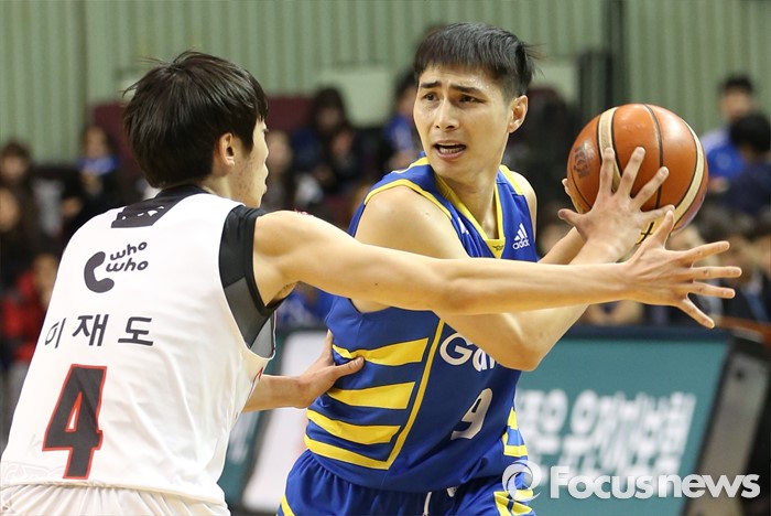(서울=포커스뉴스) 28일 서울 잠실실내체육관에서 열린 2015-2016 프로농구 삼성-KT 경기에서 KT 이재도가 삼성 주희정의 진로를 차단하며 밀착 수비를 하고 있다.