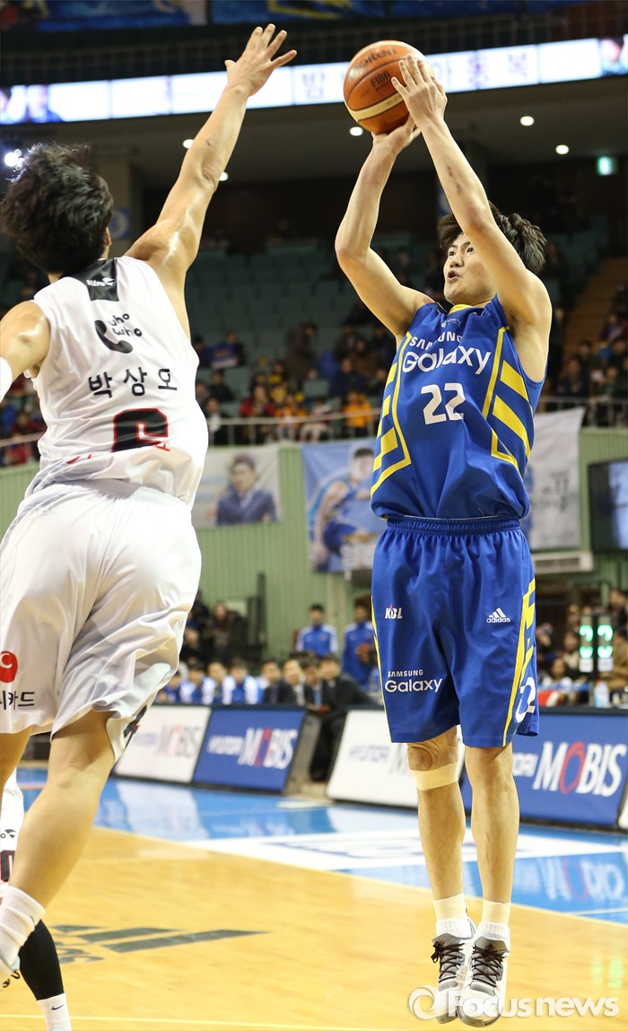 (서울=포커스뉴스) 28일 서울 잠실실내체육관에서 열린 2015-2016 프로농구 삼성-KT 경기에서 삼성 이동엽이 KT 박상오를 앞에 두고 점프슛을 시도하고 있다.