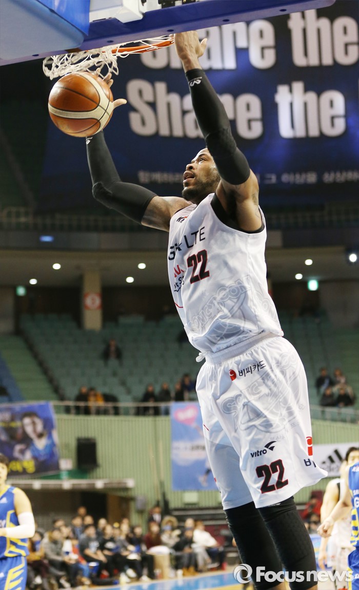 (서울=포커스뉴스) 28일 서울 잠실실내체육관에서 열린 2015-2016 프로농구 삼성-KT 경기에서 KT 블레이클리가 투핸드 덩크를 성공시키고 있다.