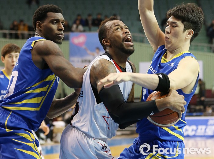 (서울=포커스뉴스) 28일 서울 잠실실내체육관에서 열린 2015-2016 프로농구 삼성-KT 경기에서 삼성 라틀리프와 김준일의 수비벽에 막힌 KT 블레이클리가 슈팅을 노리고 있다.