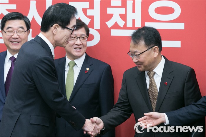 (서울=포커스뉴스) 유일호(오른쪽) 경제부총리와 이준식 사회부총리가 29일 오전 서울 여의도 국회에서 열린 저출산 대책 당정협의에 참석해 악수하고 있다.