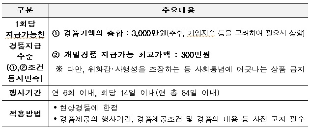 현상경품의 경우 개별 경품 지급가능 최고가액(1등 당첨자 수령 가능금액) 300만원 및 총 경품가액 3000만원 범위 안에서 제공이 허용된다. 다만 총 경품가액의 총합은 추후 가입자 수 등을 고려해 필요 시 상향할 방침이다.