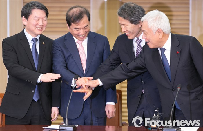 (서울=포커스뉴스) 29일 오후 서울 여의도 국회 의원회관에서 열린 '참여정부 시절 청와대 정책실장을 지낸 김병준 국민대 교수 초청 간담회, 한국정체 제3의 길을 말한다'에 참석한 안철수(왼쪽부터) 국민의당 인재영입위원장, 김 교수, 한상진 국민의당 공동창당준비위원장, 김한길 상임부위원장이 취재진을 향해 포즈를 취하고 있다.