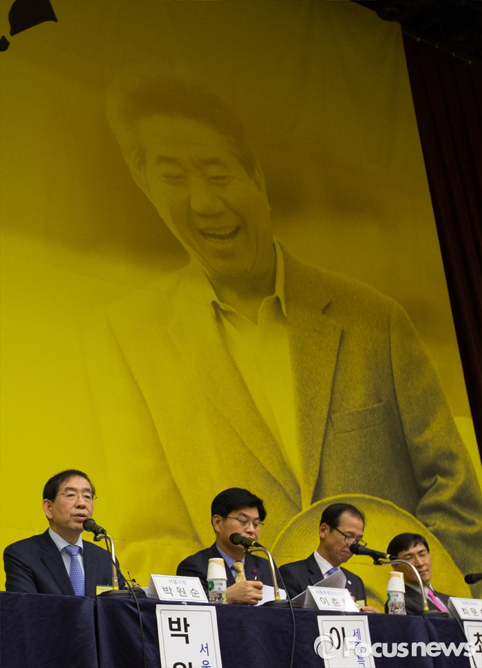 (세종=포커스뉴스) 29일 오후 세종시 정부세종컨벤션센터 국제회의장에서 열린 국가균형발전선언 12주년 기념행사 및 심포지움에 참석한 박원순 서울시장이 인사말을 하고 있다. 왼쪽부터 박원순 서울시장, 이춘희 세종시장, 최문순 강원지사, 안희정 충남지사.