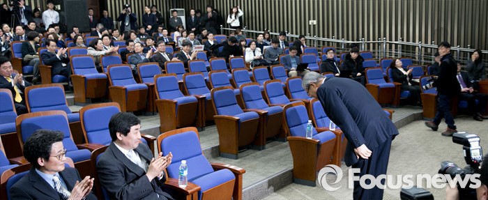 (서울=포커스뉴스) 김종인 더불어민주당 비대위원장이 29일 오후 서울 여의도 국회에서 열린 의원총회에 참석해 의원들을 향해 인사하고 있다.