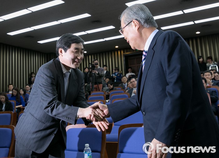 (서울=포커스뉴스) 김종인(오른쪽) 더불어민주당 비대위원장과 이종걸 원내대표가 29일 오후 서울 여의도 국회에서 열린 의원총회에 참석해 인사하고 있다.