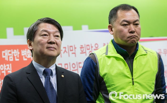 (서울=포커스뉴스) 국민의당 안철수 의원이 29일 오후 서울 마포구 국민의당 당사에서 열린 입당 인사 기자회견에서 환경미화원 임종성씨와 나란히 서 있다.