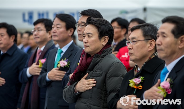 (수원=포커스뉴스) 남경필(오른쪽 세 번째) 경기도지사를 비롯한 주요 내빈들이 29일 오후 경기도 수원시 영통구 신분당선 광교중앙역에서 열린 '정자-광교 복선전철 개통행사'에 자리해 국민의례를 하고 있다.