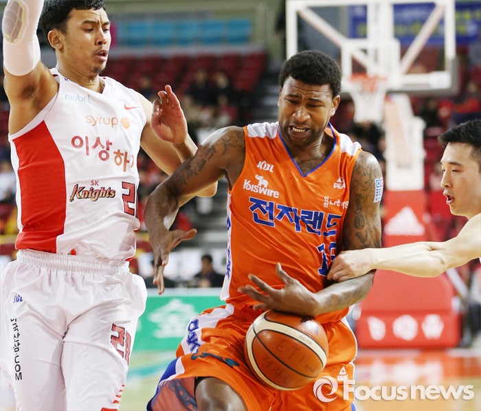 (인천=포커스뉴스) 29일 인천 삼산체육관에서 열린 2015-2016 프로농구 전자랜드-SK 경기에서 돌파를 시도하던 전자랜드 포웰이 SK 변기훈의 파울에 볼을 놓치고 있다.