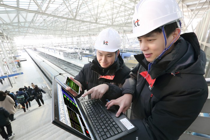 LG유플러스도 2월6일부터 14일을 특별소통 대책 기간으로 정하고 24시간 가동되는 서울 상암동 종합상황실을 개소해 비상사태에 대비하기로 했다. 전국 주요 고속도로와 휴게소, 공원묘지에 증가하는 트래픽을 처리하기 위해 비상 대책반도 운영한다.KT 직원들이 설연휴 귀향객들이 몰리는 서울역에서 트래픽을 확인하고 있다.<사진제공=KT>