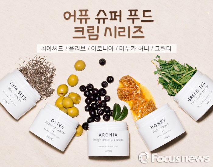 (서울=포커스뉴스) 화장품 브랜드 어퓨는 치아씨드‧올리브‧아로니아‧마누카 허니‧그린티 등 피부에 좋은 슈퍼 푸드를 함유한 ‘슈퍼 푸드 크림 시리즈’를 출시했다.