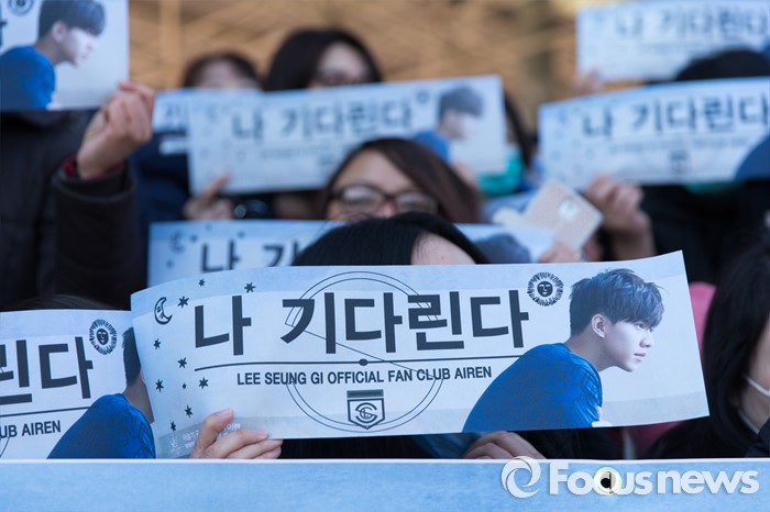 (논산=포커스뉴스) 1일 오후 충남 논산 육군훈련소 앞에서 가수 겸 배우 이승기의 팬들이 응원 문구가 적힌 현수막을 들고 입소를 기다리고 있다.