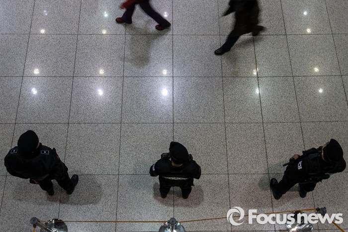 (인천공항=포커스뉴스) 인천국제공항에 폭발물 의심 물체와 함께 아랍어로 된 협박성 메모가 발견된 사건 수사가 진행되고 있는 1일 오후 폭발물 의심 물체가 발견된 인천공항 입국장 화장실에서 경찰병력이 경계 근무를 서고 있다.