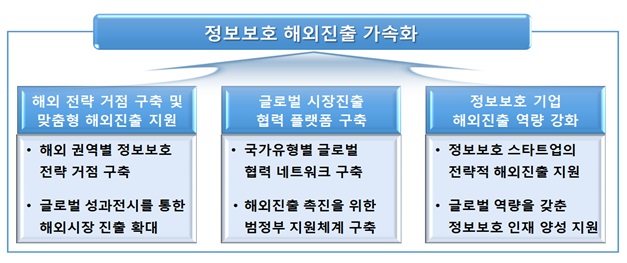 미래부는 실제성과 창출을 위해 △정보보호 해외 전략거점 구축 및 맞춤형 해외진출 지원강화 △글로벌 시장진출 협력 플랫폼 구축 △정보보호기업 해외진출 역량강화 등 3대 과제를 중점적으로 추진해 나갈 계획이다.