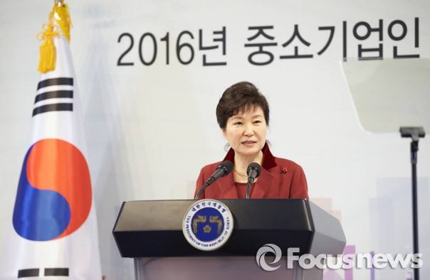 '경제활성화 입법, 수출로 보답하겠습니다'라는 슬로건으로 진행된 이번 행사에는 주형환 산업통상자원부장관, 이기권 고용노동부장관 등이 함께 했다.설 명절을 앞두고 박근혜 대통령이 3일 중소기업 현장을 찾아 어려운 경제 상황 타계 방안을 모색했다. 사진은 1월 18일 열린 2016년 중소기업인 신년인사회에 참석해 축사를 하는 박 대통령. 2016.02.03 <사진출처=청와대>