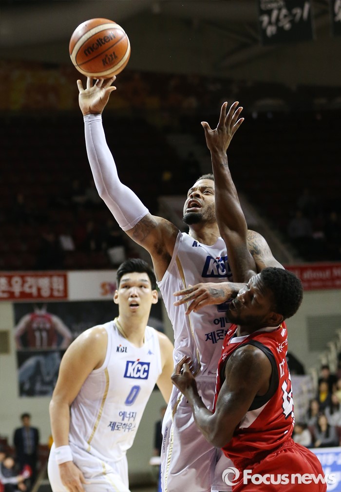 KCC는 에밋이 33득점 6리바운드 5어시스트로 연승 주역이 됐다. 하승진(12득점) 전태풍(10득점)으로 힘을 보탰다. 모비스는 양동근이 21득점으로 활약했으나 전준범(15득점) 외에 득점 지원을 제대로 받지 못했다.(안양=포커스뉴스) 13일 안양실내체육관에서 열린 2015-2016 프로농구 KGC-KCC 경기에서 KCC 안드레 에밋이 KGC 마리오 리틀의 수비를 제치며 원핸드슛을 시도하고 있다. 2016.01.13 우정식 기자