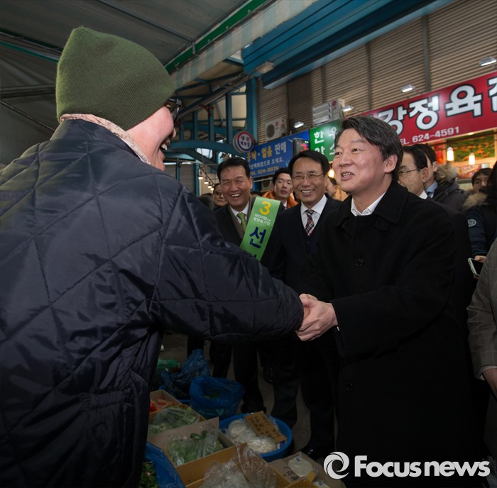 | △ 신도시장에서 상인들과 인사 나누는 안철수 |