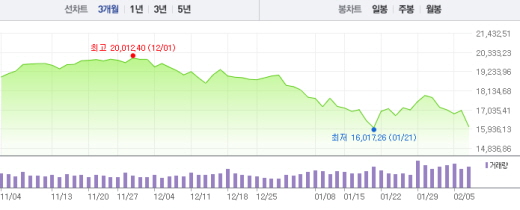 전날 5.4% 폭락한데 이어 이날도 하락하면서 1만6000선이 깨졌다. 지수가 1만6000선으로 떨어진 것은 것은 지난 2014년 10월31일 이후 1년 4개월만이다.