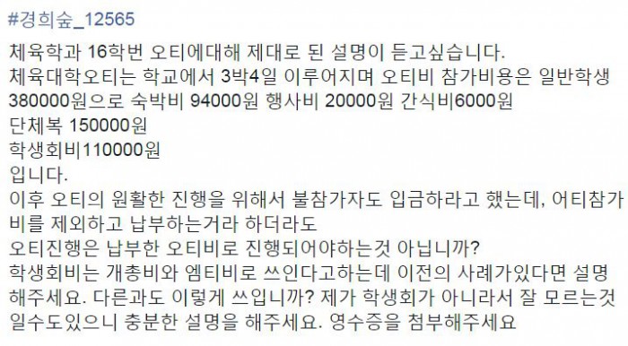 경희대 체대 신입생 OT '38만원?'…학생 해명 요구