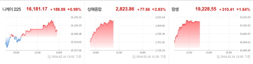(서울=포커스뉴스) 아시아증시가 지난주 폭락을 딛고 16일 모두 일제히 상승세를 보이고 있다. 국제유가가 30달러선 회복을 앞두고 있고 유럽증시의 상승세 등이 영향을 끼치면서 국제 금융시장 불안에 대한 우려가 줄어든 것으로 보인다.