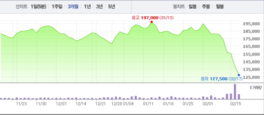 박종대 하나금융투자 연구원은 “코스맥스의 지난해 4분기 연결 기준 매출액과 영업이익은 각각 1357억원과 50억원을 기록했다”면서 “매출액과 영업이익 모두 시장 기대치(매출 1420억원, 영업이익 110억원)에 못 미쳤다”고 말했다.주가흐름<사진출처=네이버 캡쳐>