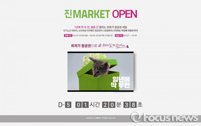 (서울=포커스뉴스) 진에어가 오는 23일 오전 10시부터 내달 3일까지온라인 특가 기획전 '진마켓' 프로모션을 열고 국내외 24개 노선 항공권을 최대 84% 할인 판매한다.