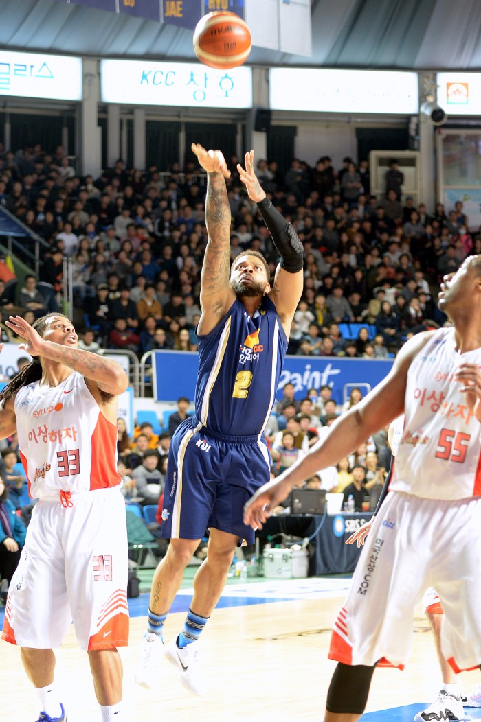 KCC는 외국인선수 안드레 에밋이 또다시 승리 주역이 됐다. 에밋은 40득점을 쏟아부으며 SK 골망을 흔들었다. 전태풍(12득점)과 김민구(10득점)도 에밋과 함께 외곽에서 제대로 지원했다. SK는 외국인선수 데이비드 사이먼(23득점 10리바운드)를 중심으로 반격을 꾀했다. 변기훈(17득점) 이정석(13득점) 박승리(12득점)도 힘을 보탰지만 김선형(8득점)의 부진이 길어지며 연패를 끊지 못했다.남자프로농구 KCC 외국인선수 안드레 에밋이 18일 열린 SK와의 경기에서 골밑슛을 하고 있다. <사진제공=프로농구연맹>