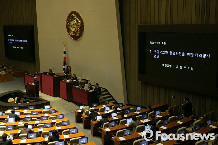 (서울=포커스뉴스) 23일 오후 서울 여의도 국회 본회의장에서 테러방지법과 관련해, 이철우 의원이 제안설명하고 있다.