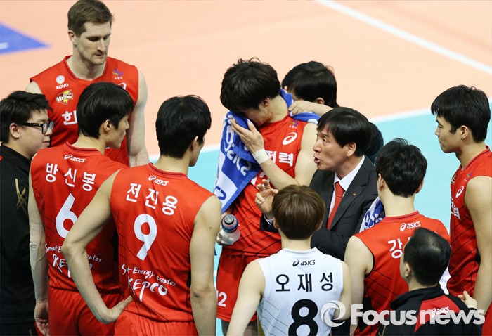 (수원=포커스뉴스) 23일 수원실내체육관에서 열린 '2015-2016NH농협 V-리그' 남자부 한국전력-삼성화재 경기에서 한국전력 신영철 감독이 선수들을 독려하고 있다.