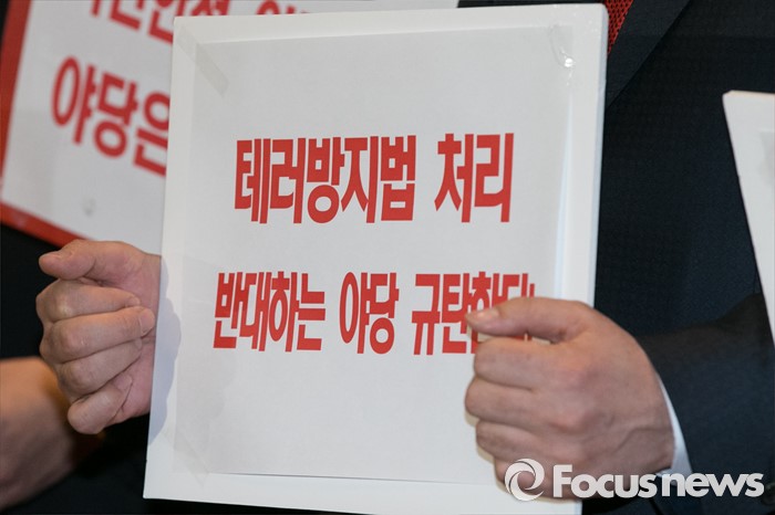 (서울=포커스뉴스) 23일 오후 서울 여의도 국회 로텐더홀에서 테러방지법과 관련한 야당의 필리버스터에 대해, 새누리당 의원들이 규탄성명 발표 전, 피켓을 들고 있다.