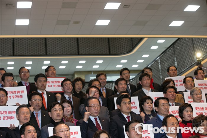 (서울=포커스뉴스) 새누리당 의원들이 23일 오후 서울 여의도 국회 로텐더홀에서 테러방지법과 관련한 야당의 필리버스터에 대해, 규탄성명을 발표하고 있다.