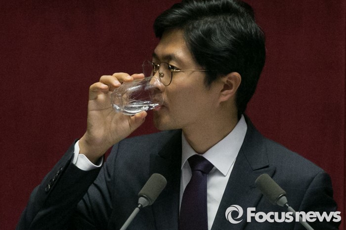 (서울=포커스뉴스) 김광진 더불어민주당 의원이 23일 오후 서울 여의도 국회 본회의장에서 테러방지법과 관련해 무제한 토론을 하던 중, 물을 마시고 있다.