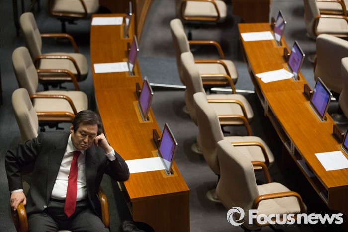 (서울=포커스뉴스) 김무성 새누리당 대표가 23일 오후 서울 여의도 국회 본회의장에서 테러방지법과 관련해 김광진 더불어민주당 의원이 무제한토론을 하는 동안 생각에 잠겨 있다.