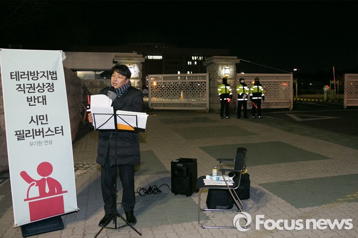 (서울=포커스뉴스) 한 시민이 24일 오전 서울 여의도 국회 정문 앞에서 테러방지법 처리를 반대하는 시민 필리버스터에 참여해 연설을 하고 있다.