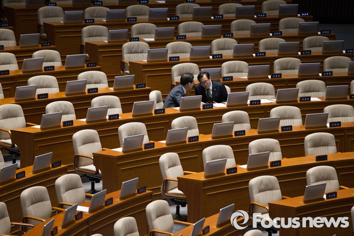 (서울=포커스뉴스) 테러방지법 처리 저지를 위한 야당의 릴레이 필리버스터가 진행중인 23일 오후 문병호(오른쪽) 국민의당 의원이 서울 여의도 국회 본회의장에서 한 의원과 대화를 나누고 있다. 문 의원은 김광진 의원의 토론이 끝난 후 두번째 주자로 필리버스터에 나섰다.