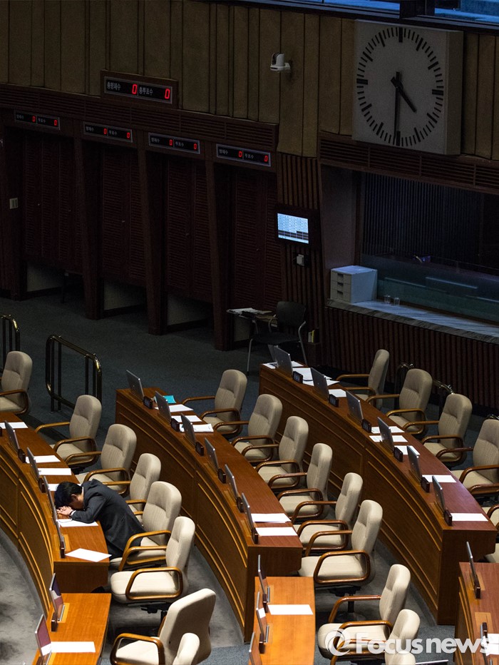 (서울=포커스뉴스) 테러방지법 처리 저지를 위한 야당의 릴레이 필리버스터가 진행중인 24일 오전 진성준 더불어민주당 의원이 서울 여의도 국회 본회의장에서 쪽잠을 자고 있다.